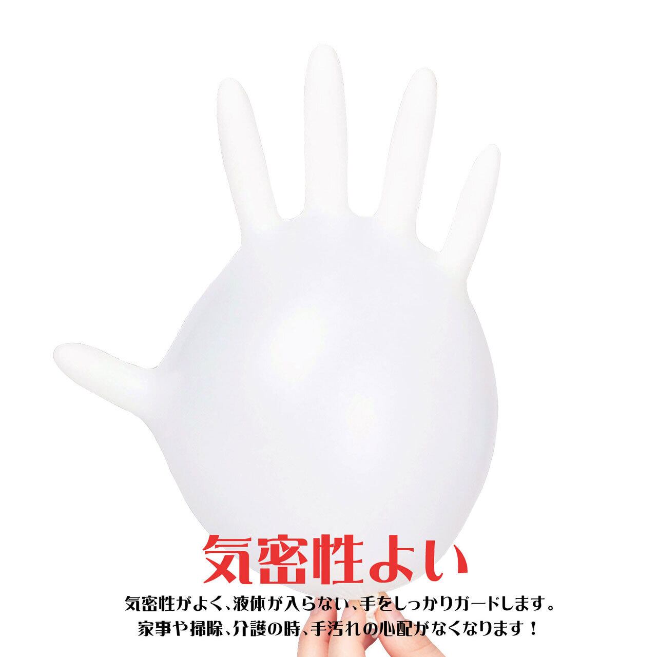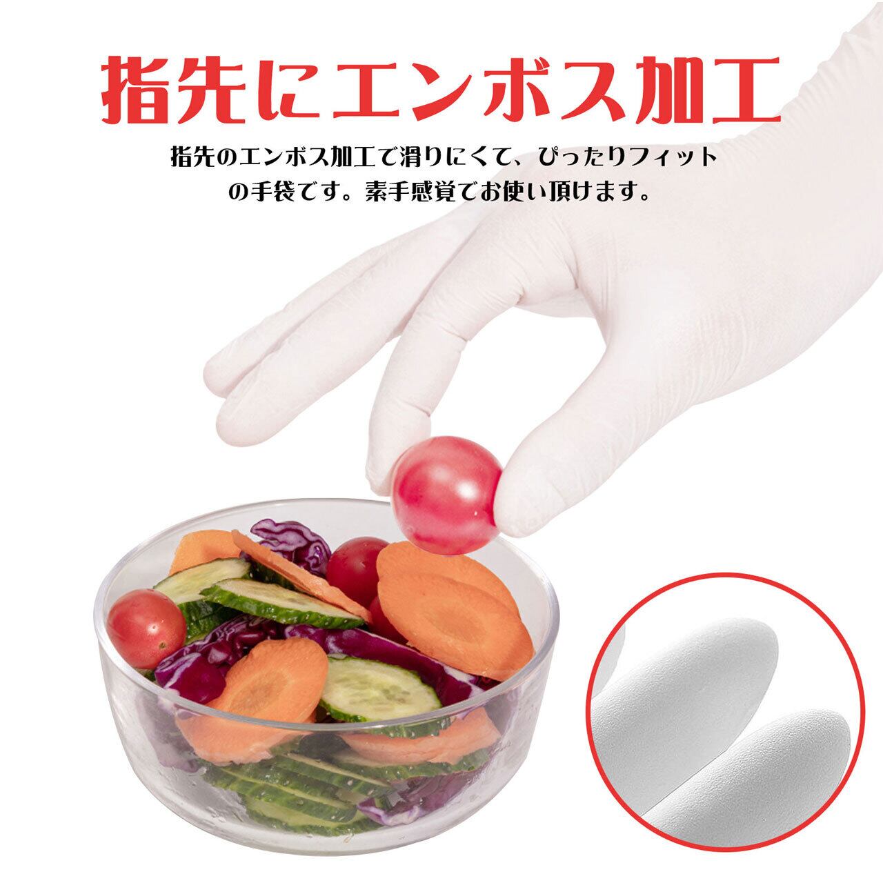 このニトリル手袋はシックな白色で、サイズはS、M、Lの3種類をご用意しております。手の大きさに応じて選んでいただけるため、快適な着用感が得られます。